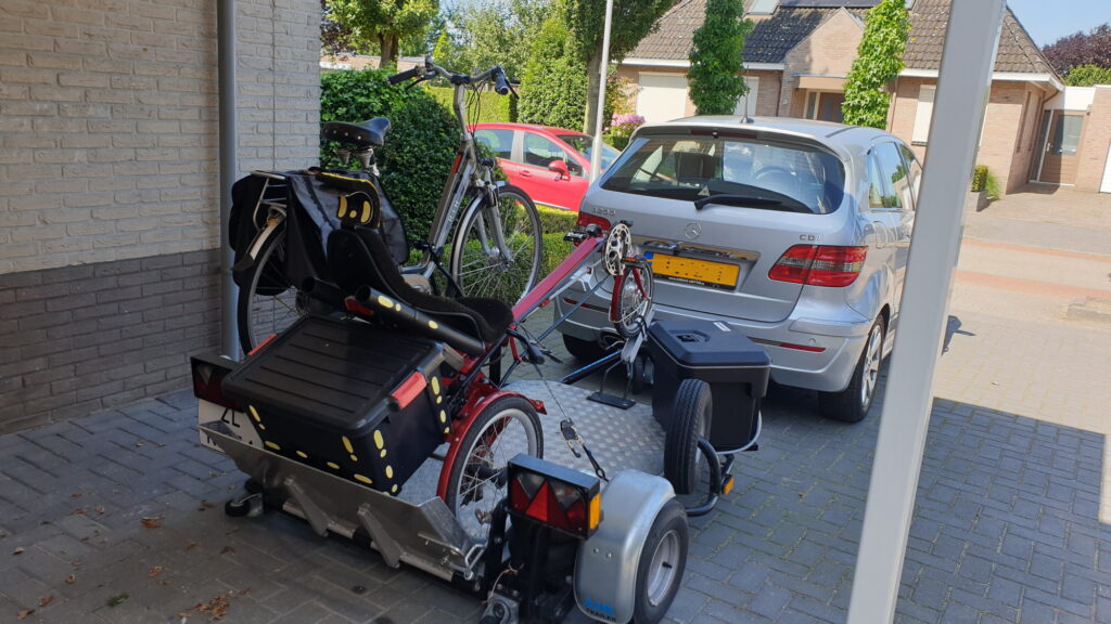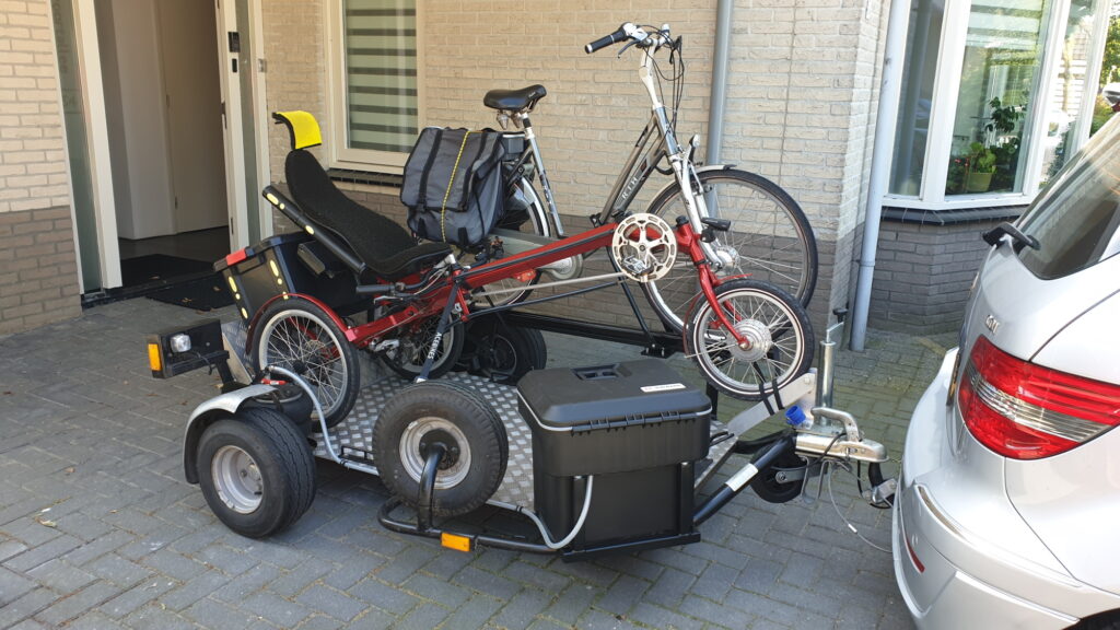 Hij stelde voor om een compressor op de aanhanger te monteren in een stevige kist. Hij maakte een leiding systeem die het gebruik van de pomp overbodig zou maken. Ik kon dan met een hendel de aanhanger omhoog laten komen. Een mechanisme dat tot op de dag van vandaag goed werkt. Het laat zien dat hij creatief is en technisch oplossingen kan realiseren. Daarnaast lasde hij een fietsenstandaard op de bestaande constructie. deze is erg stevig en handig in gebruikt. Twee upgrades waar ik erg veel voordeel aan beleef.